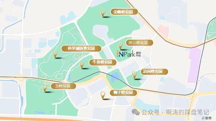 七大公园(环山岭公园、科学城体育公园、尖峰岭公园、牛角岭公园、玉树公园、狮子岭公园和边岗岭公园)在旁,形成13.12KM的环山绿道连廊,于青绿中私享自然静谧清新,告别钢筋水泥丛林的沉闷与呆板,畅想喧嚣之外的绿色富氧、舒适自然的商务景观空间,赋能企业坐享绿色商务头等舱。