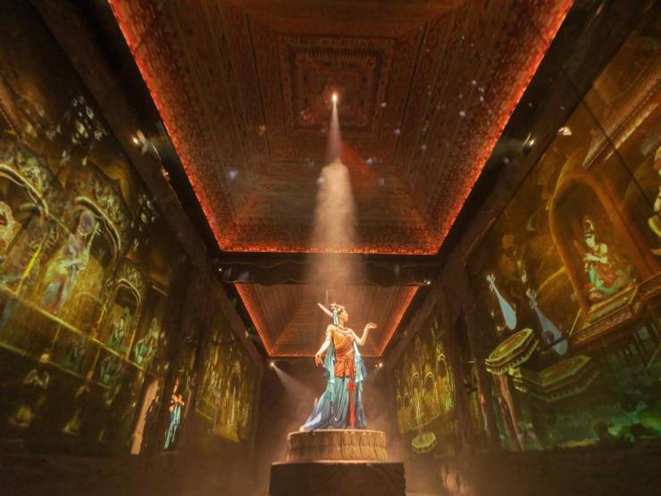活动以全新的方式打开乐动敦煌,同线上网友共赏千年乐舞,共游上元市集,让古籍、古文献、古乐器、古乐谱研究“活”起来、动起来。采用“走播”形式在乐动敦煌剧场A、B1、B2、C四大观演区中穿梭,引领线上网友观看全球首部洞窟式沉浸体验剧《乐动敦煌》。过程中,可看、可听、可游走、可互动的莫高窟“活的”第736窟徐徐展开,“鲜活”展示莫高窟4.5万平方米壁画最精华部分,再现敦煌乐舞、诗歌和壁画风采。