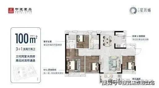 100㎡别墅级户型,大面宽短进深,南北通透,户型方正