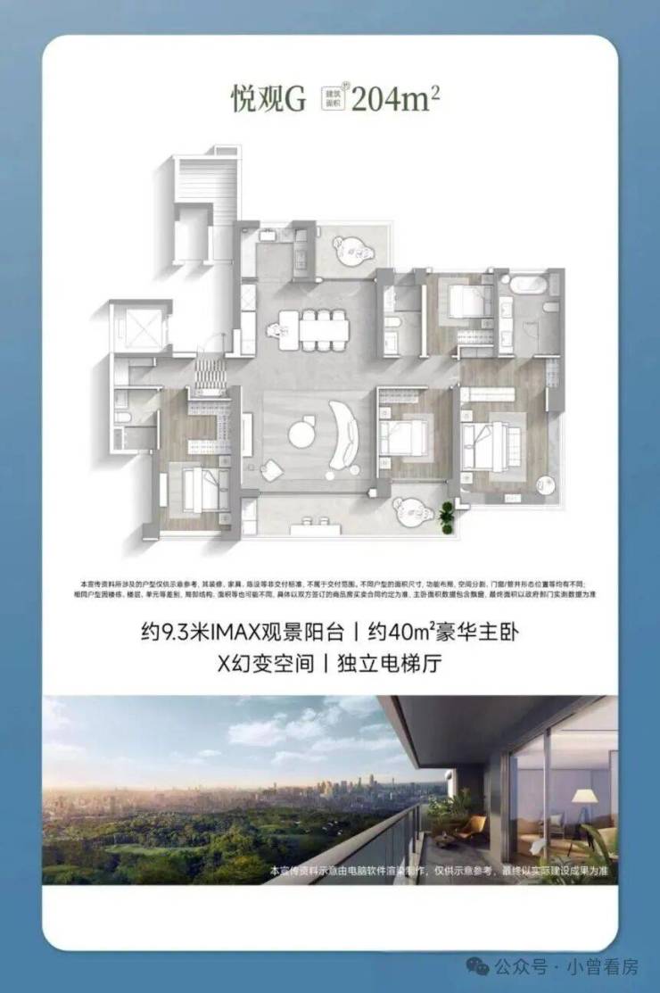 204㎡的大户型则配备独立电梯入户,约 9.6 米的南向观景阳台连通客厅和次卧,48㎡的豪华主卧带有酒店式双台盆主卫,X 幻变空间可以根据家庭需求灵活改造,适合多代同堂居住。此外,项目还有 300㎡左右的大平层产品,适合对空间有更高需求的家庭。