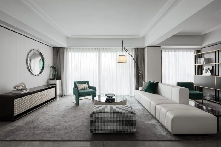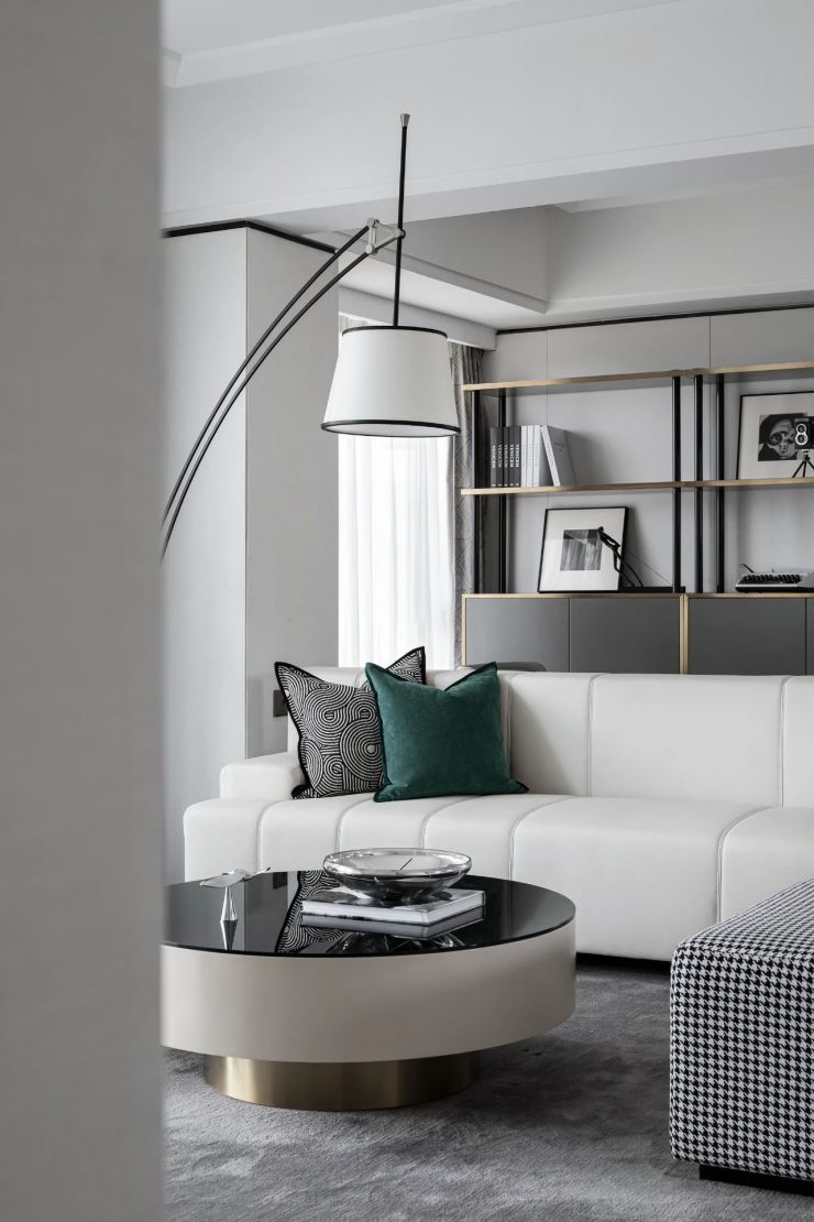 秉持纯粹自然的美学思维,摒弃繁琐的装饰,以现代空间几何感取而代之 。自然光线投射出的暖意与恰到好处的空间陈设,氤氲家的宁静与温馨。纯色沙发,圆形茶几,搭配颇具设计感的灯饰,动感与秩序之美呼之欲出。