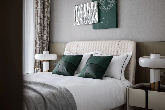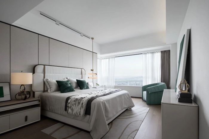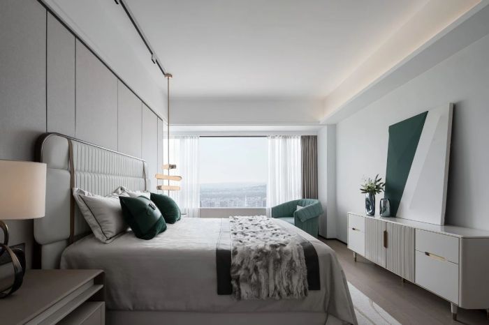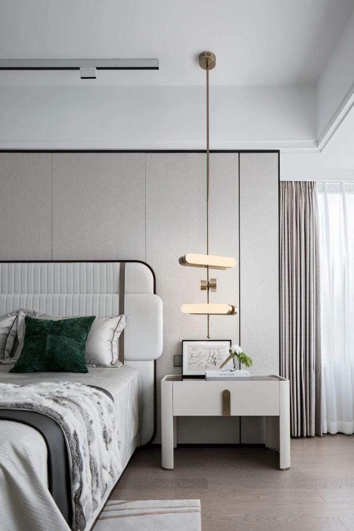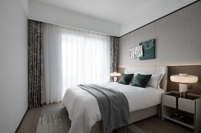 主卧空间配色素雅,极为克制。承接总体空间设计规范, 几抹墨绿让心灵得以收获片刻的慰藉与愉悦。电视柜之上的挂画和摆件互相呼应,座椅时尚高雅,与空间氛围相得益彰。