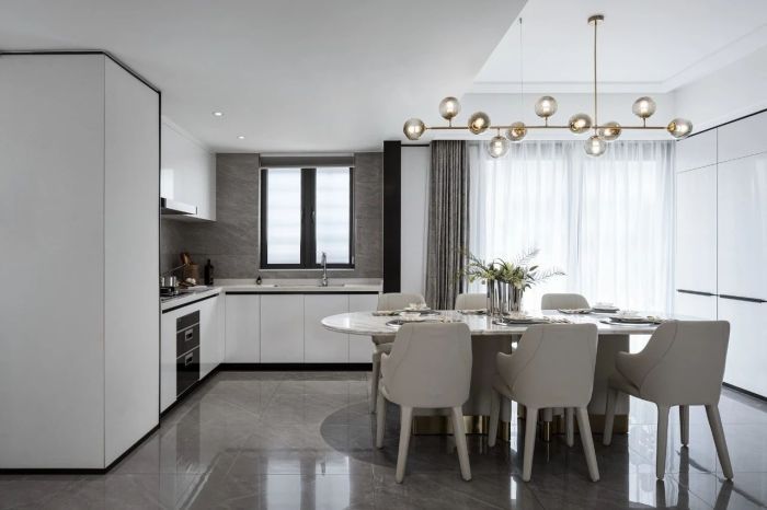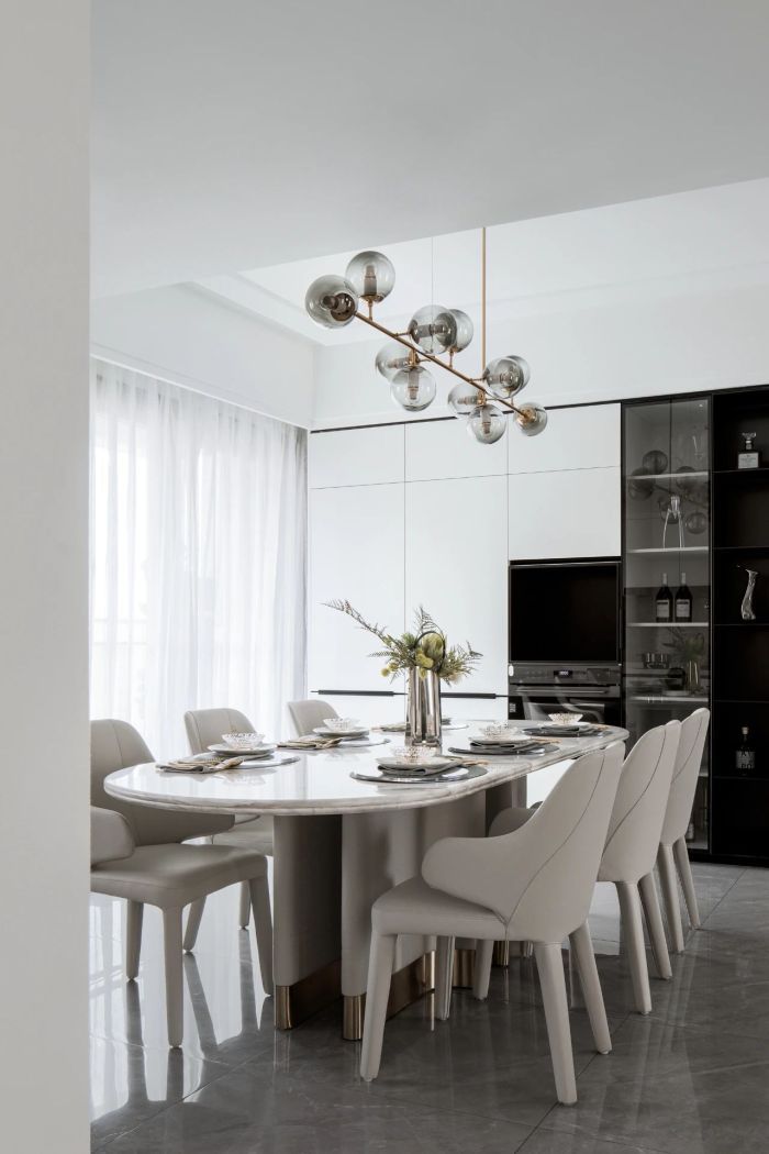 开放式布局让生活的尺度和待客的气氛尽情延展, 餐桌方寸之间,承载生活的理想与美好。暖白色空间配色搭配墨绿色餐具,自然简单的内核张弛有度,蕴含当代设计的美感与深度。