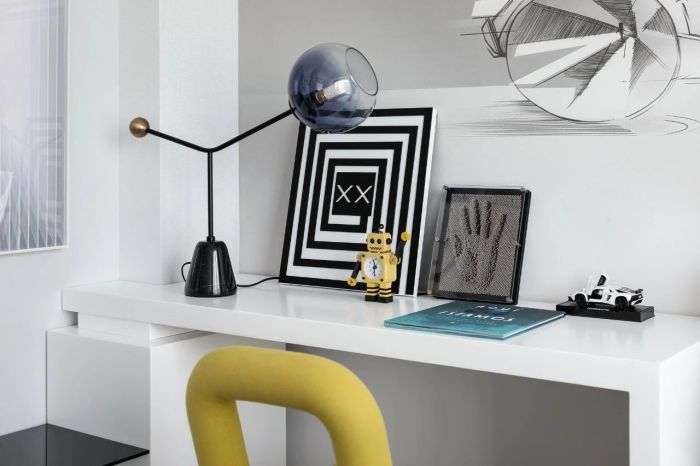 演绎色彩的思绪,明黄色极具设计感的座椅、星空色台灯,串联起空间的冷暖碰撞,色彩韵律优雅跳跃,想象力在此迸发。