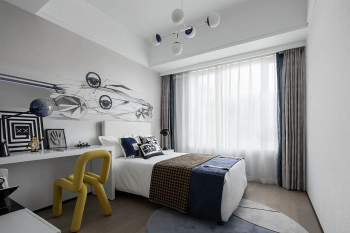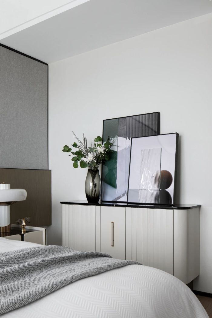 以材质承载着情绪,用光影刻录着时间。次卧空间抛开形式, 从情感层面直击内心,回归家的本真。褶皱感装置艺术与挂画线条融为一体。生活美学蕴藏在每个细节之中。