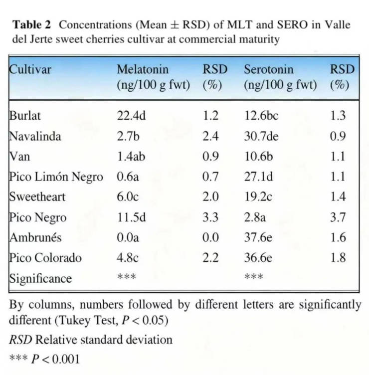 因此,可以看出,即使是甜樱桃这同一种水果,不同的栽培品种之间褪黑素和血清素的含量也是天差地别的。