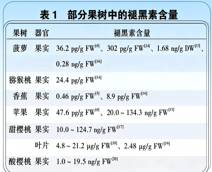 而香蕉、猕猴桃及菠萝的果实含量较低,多为皮克级别(1纳克ng = 1000皮克pg),其中香蕉最低,褪黑素含量为0.46–8.9 pg/g FW。