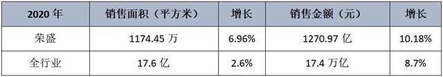 2020年,荣盛实现签约面积1174.45万平方米,同比增长6.96%;累计签约金额1270.97亿元,同比增长10.18%。而中国商品房全年销售面积为17.6亿平方米,同比增长2.6%;销售金额为17.4万亿元,同比增长8.7%。对比可知,无论销售面积和金额,荣盛均跑赢全行业,以较大优势先进于行业增幅。