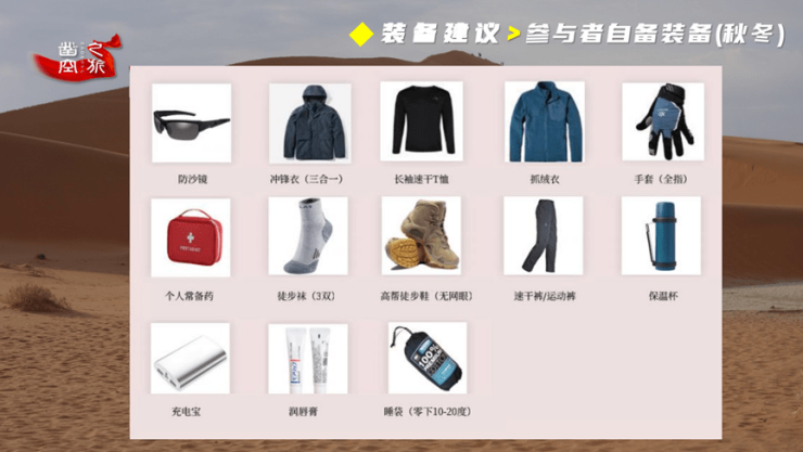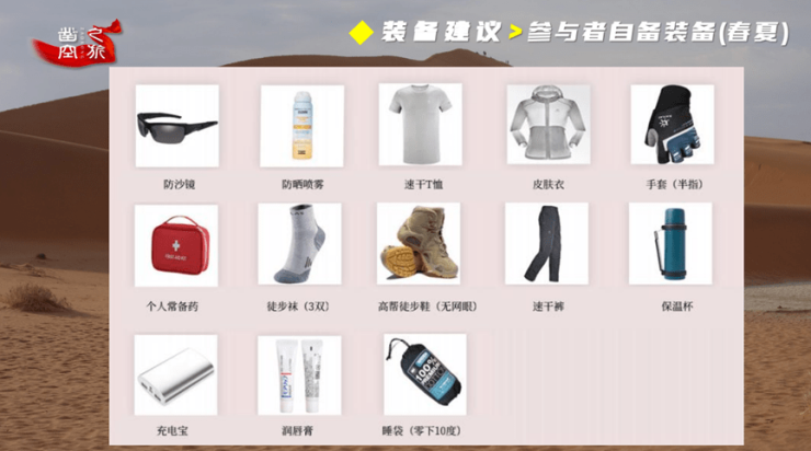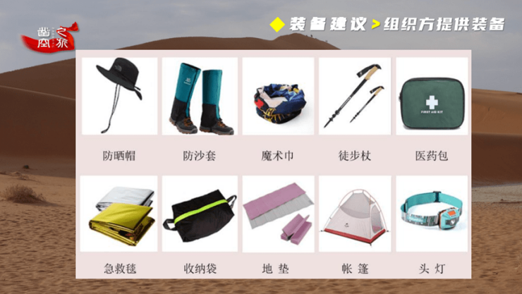 侯歌提醒,在沙漠徒步旅行中,保障人身安全为首要任务,不仅是在沙漠、戈壁,或是“无人区”,都要带齐三样东西,包括两个硬件和一个软件。其中,两个硬件指的是急救毯和指北针,一个软件指的是,要对山野户外和大自然保持敬畏的态度。