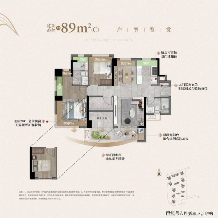 89㎡3房2卫,第一眼看去以为是120平的户型;6米长的阳台,南北对流的设计,主卧270°全景窗;还能做到南北对流。