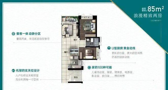 在户型设计上,项目推出了建面约73平方米的江景两室户型,凭借其独特的优势成为市场热销产品。该户型采用U型厨房设计,可与餐厅灵活打通形成“社交厨房”;阳台可根据需求改造成灵动空间,满足不同生活阶段的需求;同时,阳台和主卧均享有开阔的视野,可直接眺望珠江支流景观,将自然美景尽收眼底。