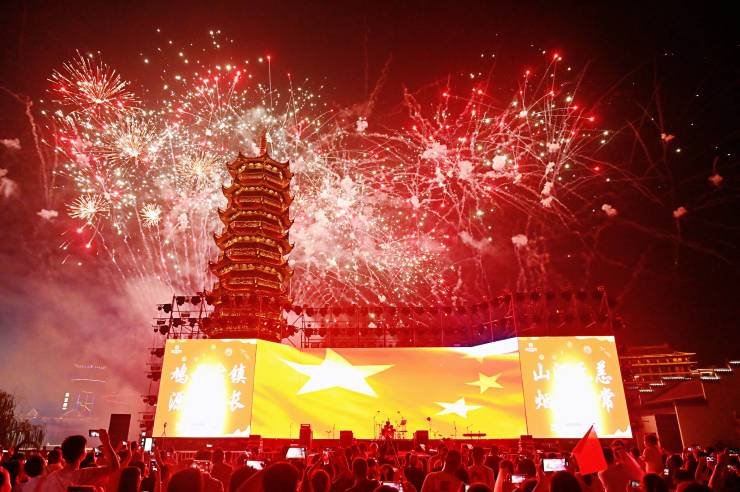 浓情古镇,国旗飘扬,到处洋溢着喜庆的氛围。“红色科技展”使游客领略到祖国的强大;“歌颂祖国演唱会”由多位音乐大咖坐镇,令游客亲身感受火热的现场盛况;烟花升空,绽放绚烂,让万千游客共同见证焰火色彩斑斓,共同祝愿祖国繁荣富强。