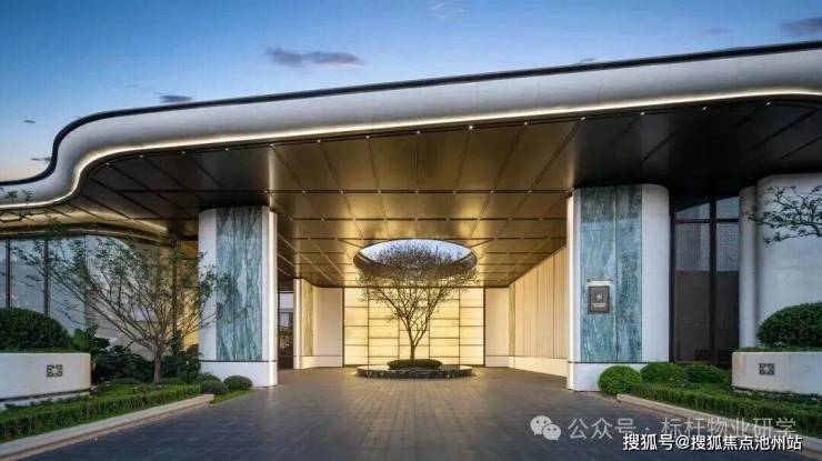 社区主入口是超宽幅门头,宽约 80m 高约 7.1m,两侧的维多利亚绿奢石以及中央的白雪公主透光石很吸睛,浅色的部分则是贝金米黄石材,圆弧的工艺处理也更显温润及价值感,中央栽植的超大紫薇树拥有约60年树龄,底部则是采用宝格丽黑奢石作为基座。