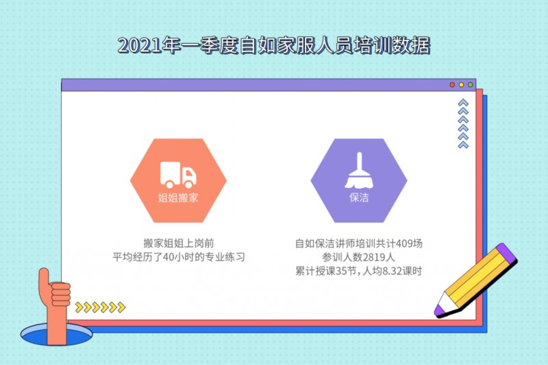 从工作理念来看,服务者对自身有着较高的职业憧憬,乐于输入工作理论和技能。数据显示,2021年一季度自如保洁讲师培训共计268场,参训人数8356人;累计授课1072节,人均9.17课时;搬家姐姐上岗前平均经历了40小时的专业练习。