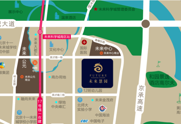 如图,“未来两兄弟”在昌平未来科学城东区,五环外,临近在建地铁17号线。距离城区更近;中铁彩璟在北六环外昌平老城区,三个项目的城市风貌不同。可以说,未来慧园更新,城市风貌更好。