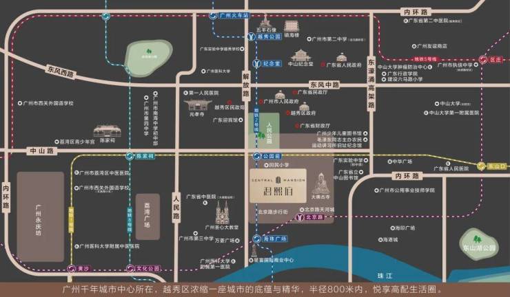 与此同时,你还能高效坐享广州至精华、浓度至高的生活配套。 约400米直达1/2号线交汇点公园前站,3公里内5地铁 ,快速通达全城; 约530米尽揽北京路商圈,广百百货、北京路天河城 等高端商业及广州酒家、陶陶居等老字号触手可及,萦绕满满的烟火气与缠绵生活感。