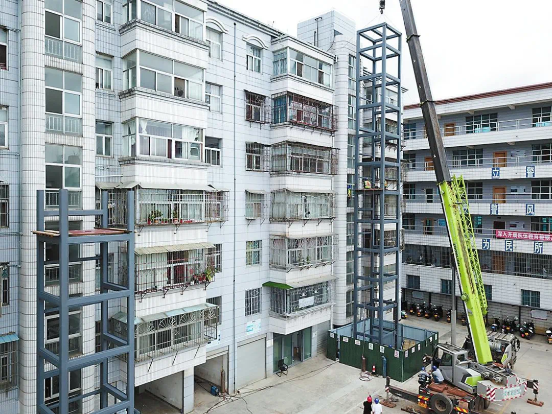 在交警小区划定的施工范围内,两部电梯井架已立于小区两幢居民楼楼道外侧,施工人员正在进行安装工作。