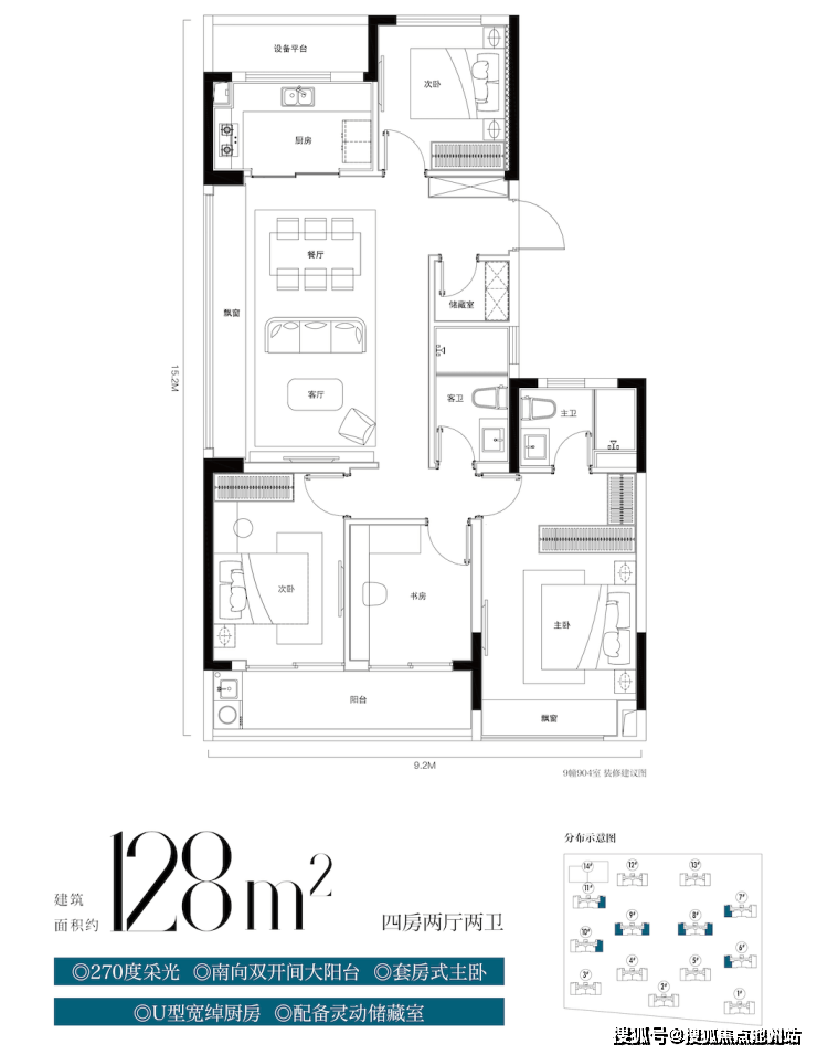 建筑面积约128㎡四房两厅两卫户型,采用“4+1”房设计,