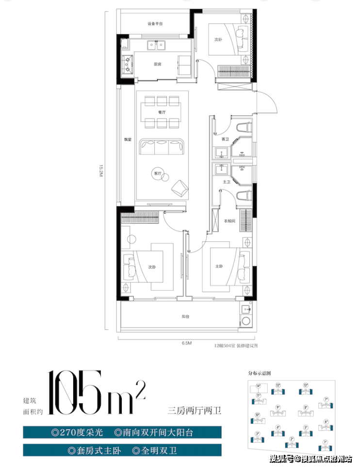 三房朝南,餐客厅尺度完全媲美140方以上户型,并且还有一个储藏间,非常贴近二孩家庭或者三代同堂家庭的需求。