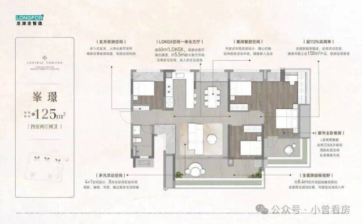 125㎡四房两厅两卫空间更开阔,采用横厅设计,搭配景观阳台,能俯瞰中央园林,适合多人口家庭。