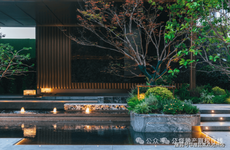 社区内,有大量水景,与绿植、地灯等搭配辉映。
