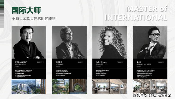 四大国际顶级设计大师团队,Kelly Hoppen、小林政彦、香港DLN刘荣广、梁志天携手,以百年公园为设计源点,诠释人与自然和谐美篇,荣获GBE年度地产设计大奖 “铂金奖”。