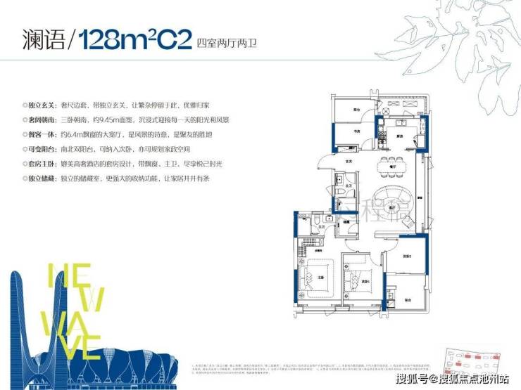 约128平户型亮点:边套设计,三房朝南,独立储藏间,南北双阳台。