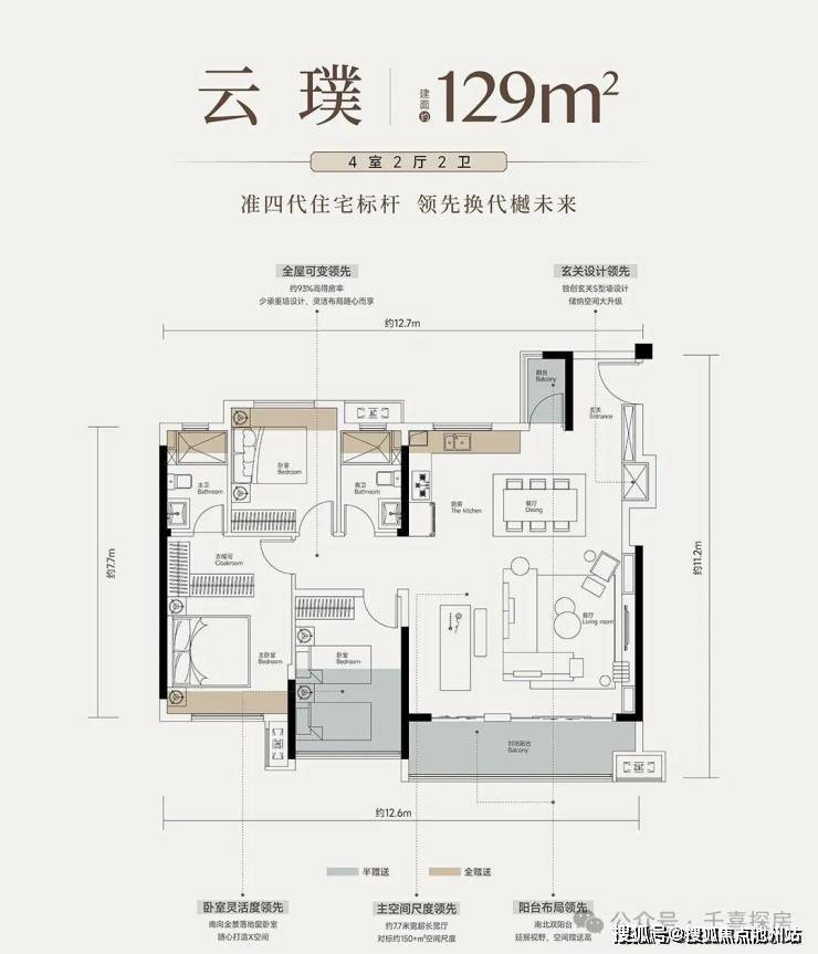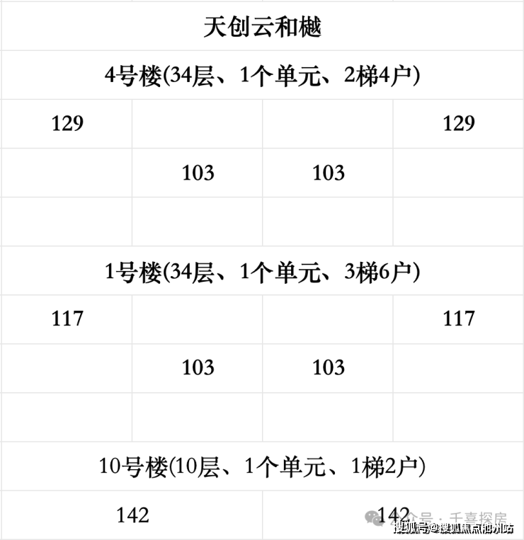 4号楼总高34层,一个单元,2梯4户,包含建面约103-129平房源