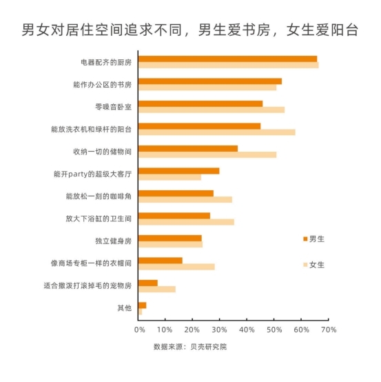 就性别而言,男生更关注书房、会客厅,可以享受宁静或接见朋友,而女生更偏爱阳台,可以种种绿植,享受生活。