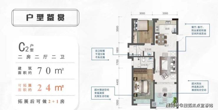 〖C2户型〗建筑面积:约70㎡拓展面积:约24㎡户型格局:二室二厅二卫(可改2+1房)