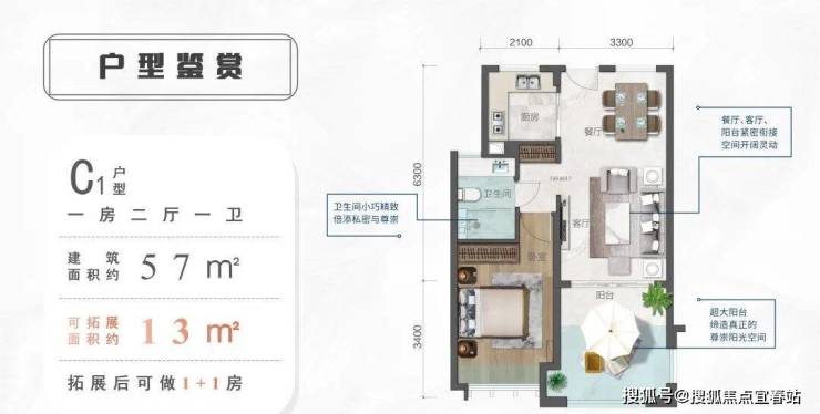 户型格局:一室二厅一卫(可改1+1房)