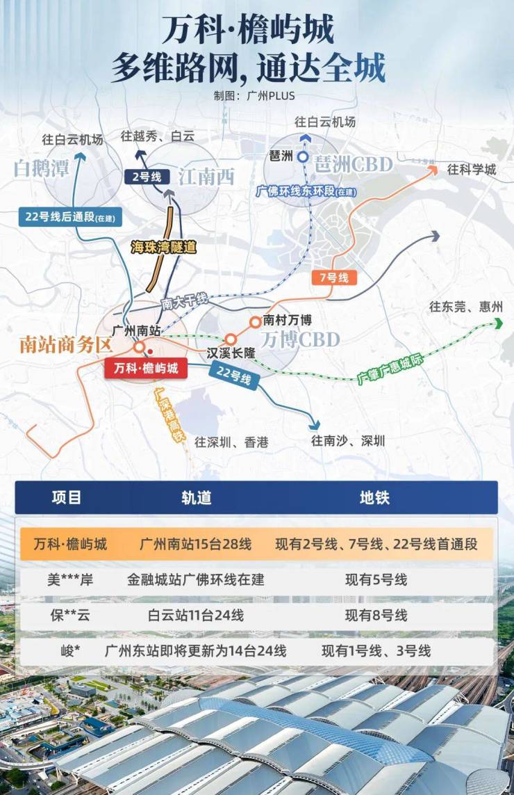 以年客流量1.7亿人次的广州南站为中枢,通过15轨交通设施的衔接与互通,无缝接驳4地铁、5高铁、6城轨,4站万博、4站海珠芯,6站珠城,位于湾区1小时通勤圈内。