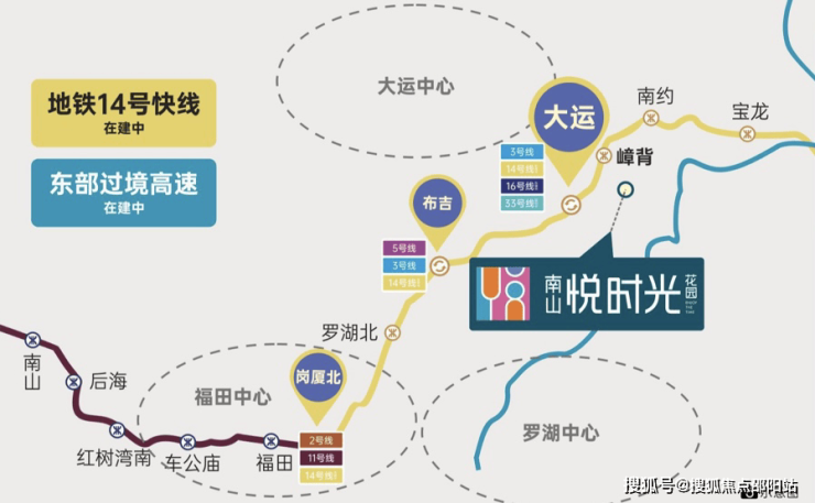 14号快线 驶入福田时区东部首条快线——14号线快线,时速达120公里,预计2022年9月底通车,南山悦时光毗邻嶂背站,1站大运,8站福田,30分钟直抵福田中心。