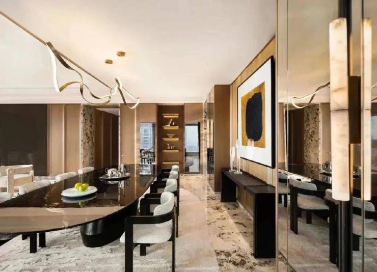 全球多达6种的稀贵奢石装点着室内,大面积、流动纹路的天然石材运用更是给人“一入户就震撼”的视觉冲击。土耳其古堡灰、意大利威尼斯棕、意大利鱼肚金和迪奥金……让室内成为一座奢石博物馆。