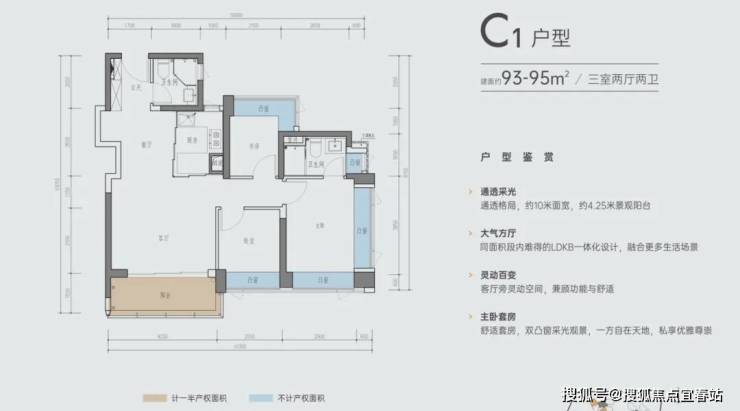 C-1户型 | 建面约93-95㎡三室两厅两卫功能性+舒适性/创新性/全周期性通透采光:通透格局,约10米面宽,约4.25米景观阳台大气方厅:同面积段内难得的LDKB一体化设计,融合更多生活场景灵动百变:客厅旁灵动空间,兼顾功能与舒适主卧套房:舒适套房,双凸窗采光观景,一方自在天地,私享优雅尊崇