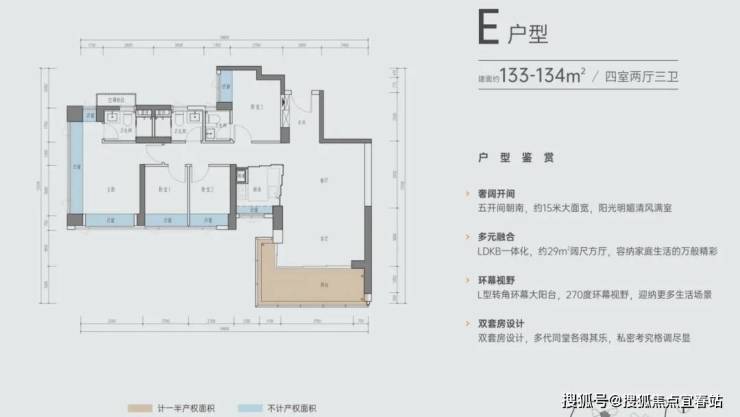 E户型 | 建面约133-134㎡四室两厅三卫,双套房主卧/舒适度升级/全周期性,奢阔开间:五开间朝南,约15米大面宽,阳光明媚清风满室,多元融合:LDKB一体化,约29m 阔尺方厅,容纳家庭生活的万般精彩,环幕视野:L型转角环幕大阳台,270度环幕视野,迎纳更多生活场景,双套房设计:多代同堂各得其乐,私密考究格调尽显