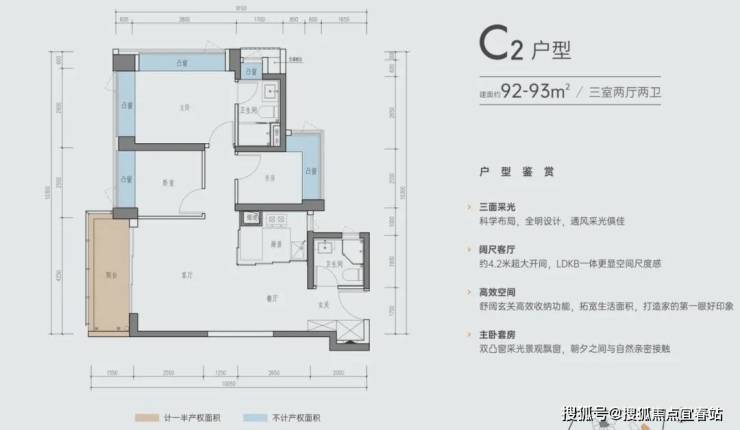 C-2户型 | 建面约92-93㎡三室两厅两卫,功能性+舒适性/稀缺性/全周期性,三面采光:科学布局,全明设计,通风采光俱佳,阔尺客厅:约4.2米超大开间,LDKB一体更显空间尺度感,高效空间:舒阔玄关高效收纳功能,拓宽生活面积,打造家的第一眼好印象主卧套房:双凸窗采光景观飘窗,朝夕之间与自然亲密接触