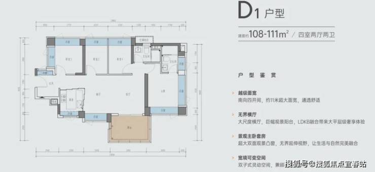 D-1户型 | 建面约108-111㎡四室两厅两卫,改善型/创新性/全周期性,越级面宽:南向四开间,约11米超大面宽,通透舒适,无界横厅:大尺度横厅,巨幅观景阳台,LDKB融合带来大平层级奢享体验,景观主卧套房:超大双面观景凸窗,无界延伸视野,让生活与自然完美融合,宽境可变空间:双子式灵动空间,兼顾功能与舒适