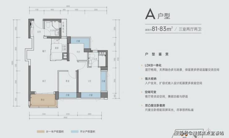 A户型 | 建面约81-83㎡三室两厅两卫功能性+性价比/创新性/全周期性LDKB一体化:竖厅格局,无界融合多元场景,保留更多舒适温馨交流空间强大收纳:入户玄关、扩容式嵌入设计拓展更多家庭空间空间可变:客厅旁灵动空间,兼顾功能与舒适双凸窗主卧套房:尺度主卧搭配双屏采光,尽享悠然私谧