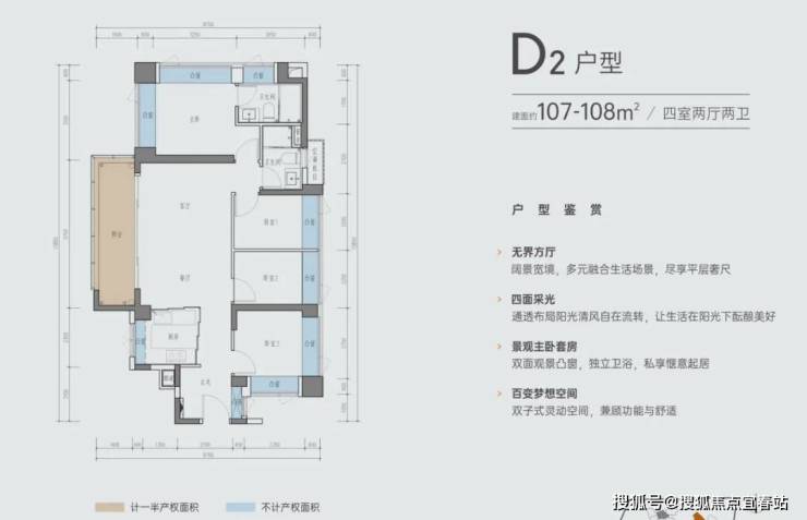 D-2户型 | 建面约107-108㎡四室两厅两卫,景观卧室/舒适度升级/功能分区/全周期性,无界方厅:阔景宽境,多元融合生活场景,尽享平层奢尺,四面采光:通透布局阳光清风自在流转,让生活在阳光下酝酿美好,景观主卧套房:双面观景凸窗,独立卫浴,私享惬意起居,百变梦想空间:双子式灵动空间,兼顾功能与舒适