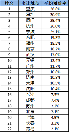 从平均溢价率来看,重庆以38.8%溢价率高居榜首;深圳以30.9%的溢价率次之;厦门、杭州和宁波的溢价率也超过20%,位居第三、第四和第五。