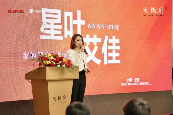 艾佳生活执行总裁、星叶艾佳总经理白茹女士介绍了全品家模式的产品系,目前在栖霞天樾府的两套实景样板间里,每套方案包含全屋活动家具、定制柜、灯具、窗帘、客厅背景墙、家电等30多件家具产品。