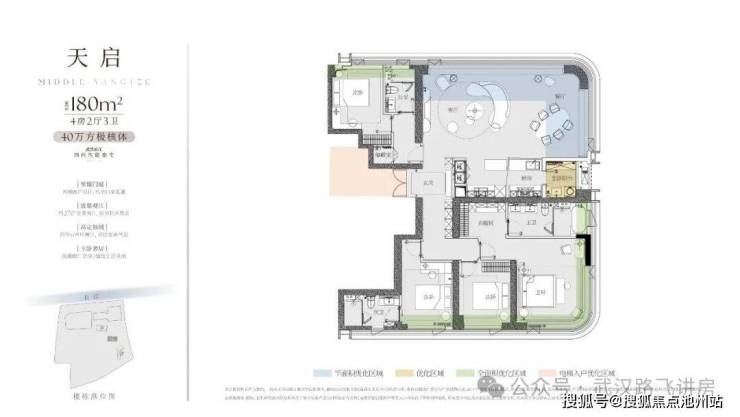 ④180㎡户型:四房两厅三卫,客厅、北向次卧拥有非常不错的看江视野,并且客厅可以270度观景;另外,东头这一户型的生活阳台、主卧套房也可以看江,观江面更大。但东头户型离3号楼较近,低楼层采光可能有所影响。