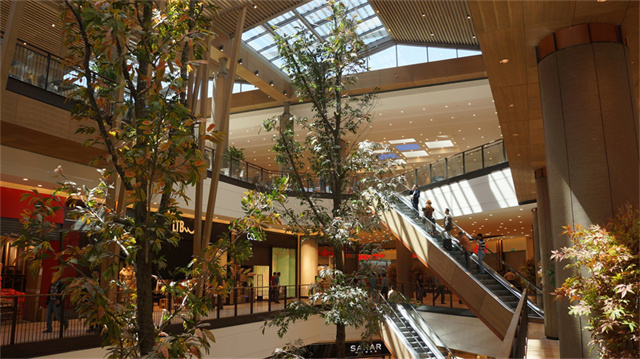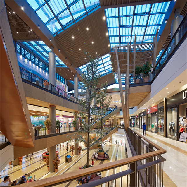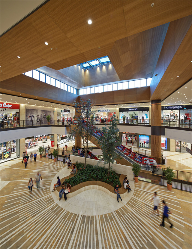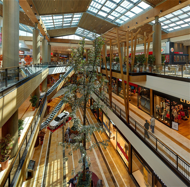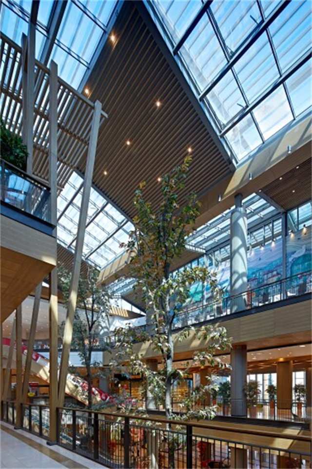 空间内的元素延续外立面的建筑风格,是空间和饰面别具一格的自然艺术展示,也是从外到内的和谐发展。通过带顶棚的日光走廊相互连接购物中心的各层商业,其中顶层区域的设计主要是通过大量的木质材料和玻璃打造。透过顶棚折射的日光将映照在歇息区域的大树上,这日光照耀的感觉同于漫步森林光影迷离的感觉。
