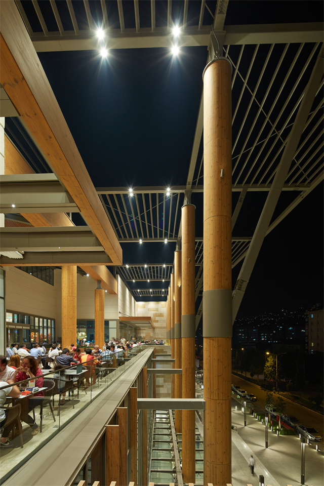 中心区域顶部起伏的天窗向上方的天空敞开,使城市中心和迪贝克山脉的多处景观可以透过天窗映入顾客眼帘。顶层区域设计规模宏大,宽敞的木材和玻璃天窗下是户外咖啡馆、开放式厨房和露台餐饮区。