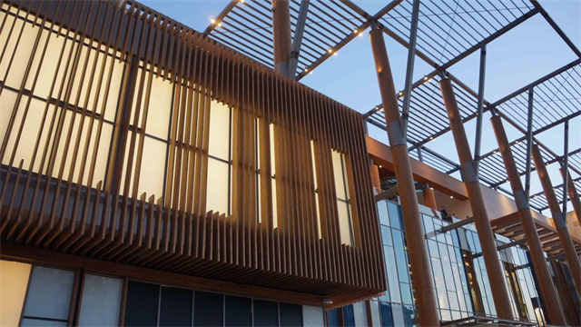 项目建筑面积36000㎡,项目定位是创造一个含游购趣味的社区空间。由5+design主持设计,总体设计风格简洁独特。特别是受当地古建筑的影响,建筑设计上结合当地材料和纹理,将历史建筑与现代建筑融合。设计灵感也来源于城市北部树木繁茂的山脉,外建筑立面玻璃窗与木材结合,营造空间的开放感和协调感。多条木质圆柱撑起的木质镂空敞篷,为购物中心入口带来轻盈自由的感觉。