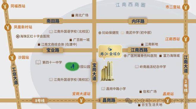 2/8号线双地铁上盖:约280米即达8号线宝岗大道站,20分钟直通达珠江新城;约800米2号线江南西地铁站,可通达广州南站等大型交通枢纽;