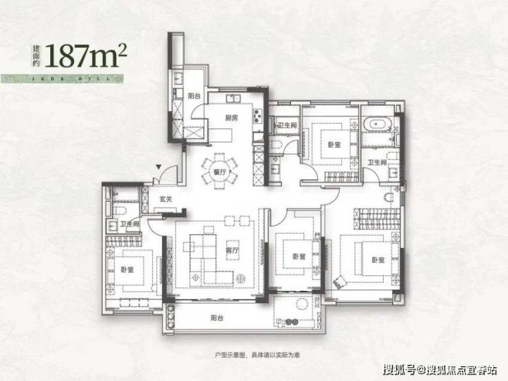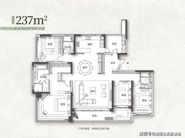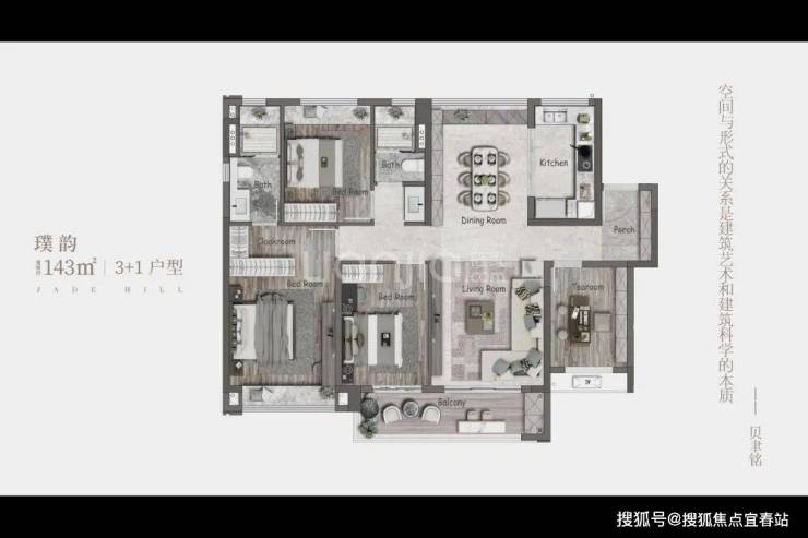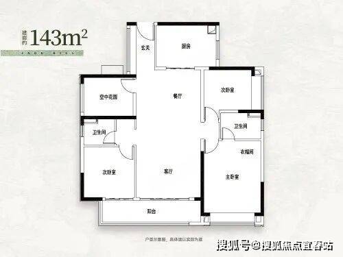 改善主力:建面约 143㎡ 四房两厅两卫,四开间朝南,7.6 米南向双联观景阳台,主卧带独立步入式衣帽间与卫浴,适配一步到位的改善客群。