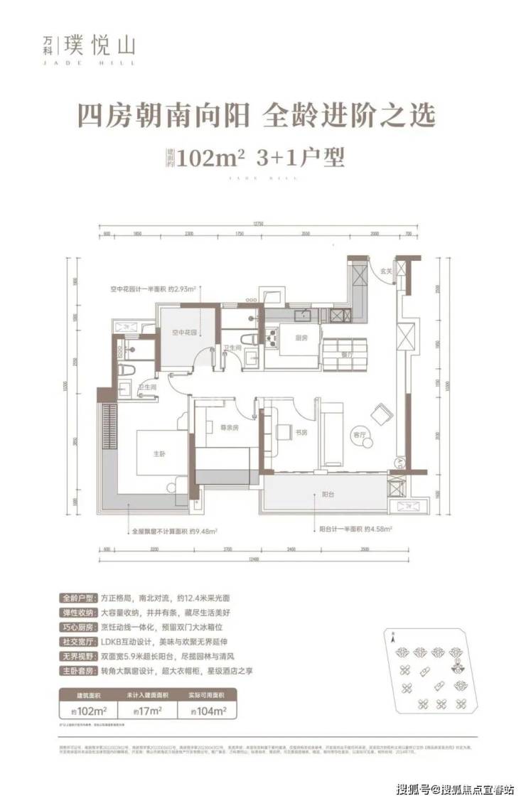 刚改主力:建面约 102㎡ 3+1 房两厅两卫,LDKB 一体化大方厅设计,5.9 米宽厅,南北双阳台对流,空间利用率拉满,适配二胎家庭、三代同堂的全周期居住需求。