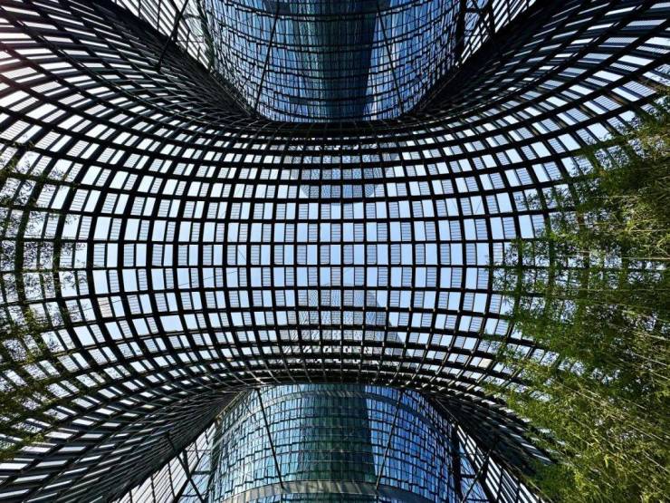 源取自然界“悬链线”和“抛物线”的设计理念,将双塔中间钢拱连廊塑造成柔和的马鞍型,最大跨度达80m,最大竖向悬垂高度约65m,平面宽度约60m,是整个项目设计施工难度最大、技术最复杂的部分,也是目前亚洲范围内已建成的最大悬垂屋面。远远看去像一条巨型项链被自然悬挂在两座塔楼中间,为大楼的刚劲气质增添了一丝柔美韵律。